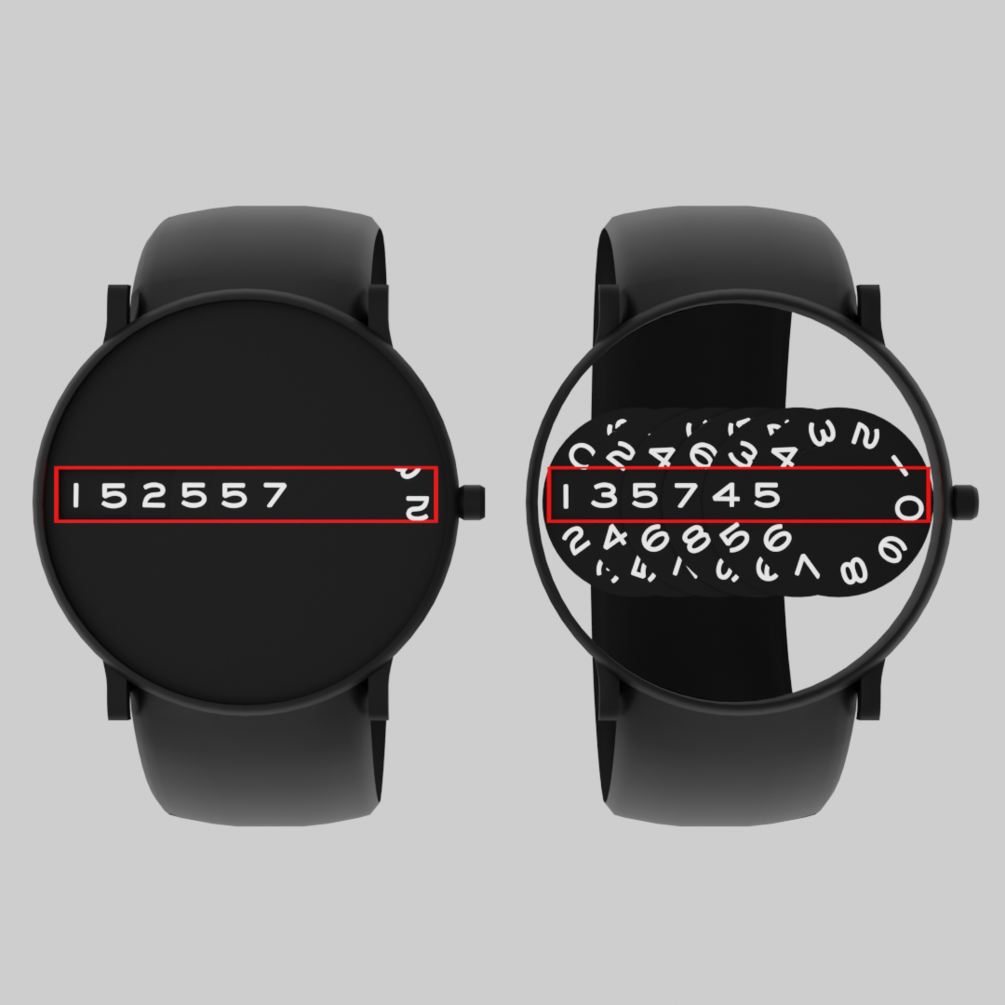 The display is done with rotating discs, that are being animated giving a feeling of a mechanical watch.