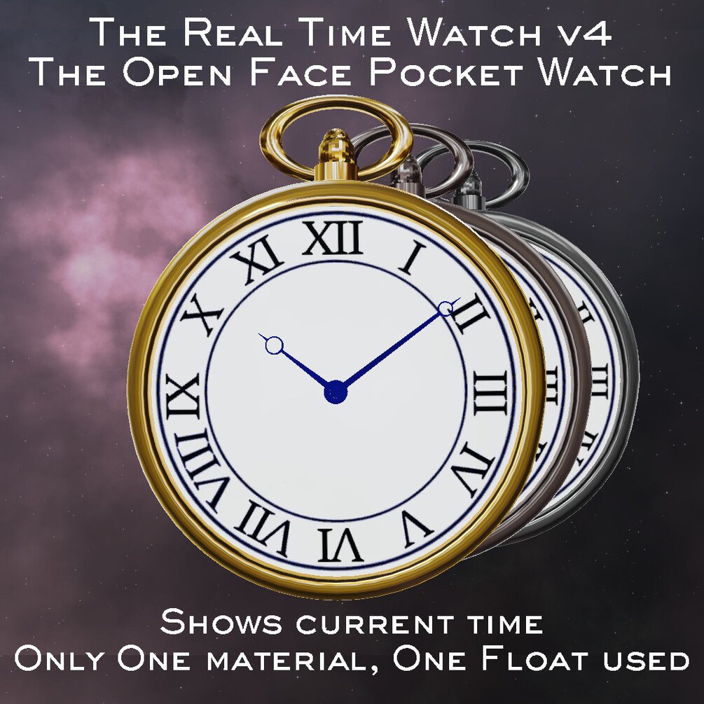 This timepiece is a fully functioning pocket watch for VRChat 3.0 avatars that shows real time. It is updated constantly using my automatic OSC app to asure maximum accuracy.